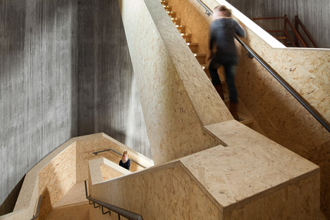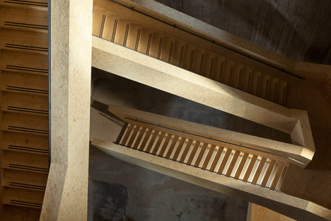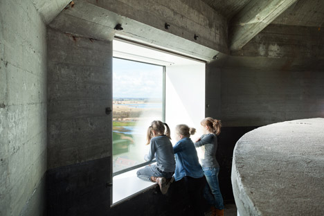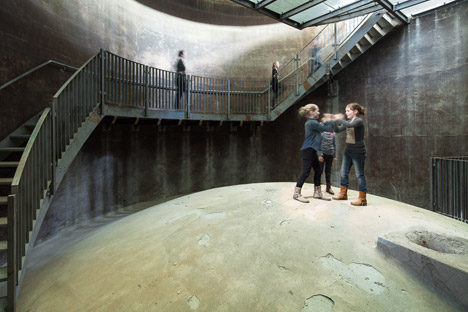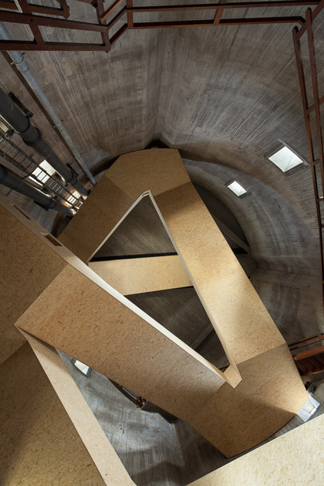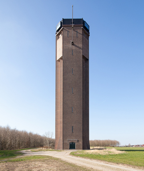 You are in a former water tower, recycled into a panoramic viewpoint on a Natural Site in the province of Overijssel in The Netherlands. The great innovation in this place is how the architects have reinvented the inside circulation with this new staircase that crosses the tower horizontally. It allows a complete new reading of the immense space available and creates new space at the top, to host large windows overlooking nature.
