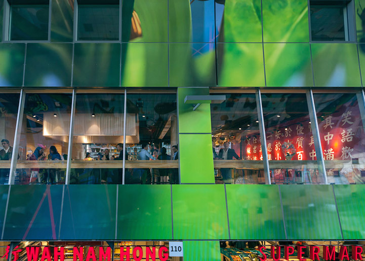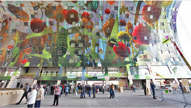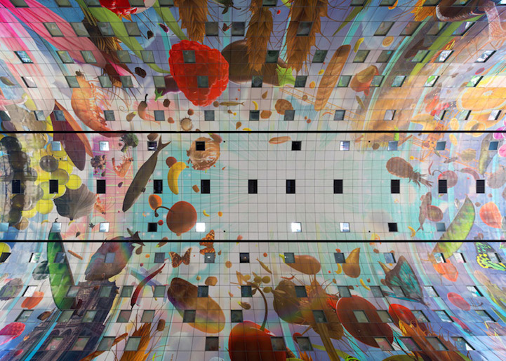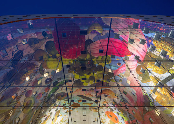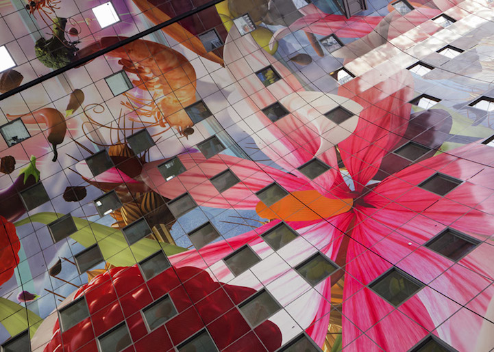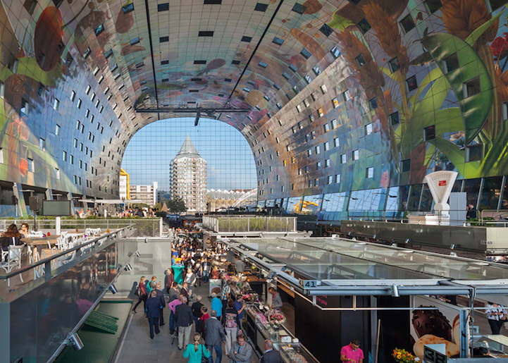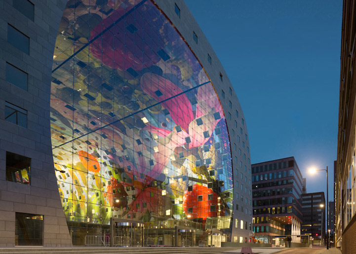 Sous cette arche fleurie, vous entrez dans le tout nouveau marché couvert de Rotterdam. Il propose 96 stands alimentaires dans les parties basses et il accueille également des restaurants, de lhôtellerie et des magasins, ainsi que des appartements dans la partie supérieure du bâtiment. De l’espace, des couleurs, de l’art, de la lumière: ce sont les éléments clés du bâtiment de ce bâtiment bien accueillant. Magnifique.