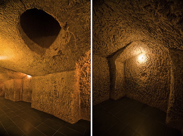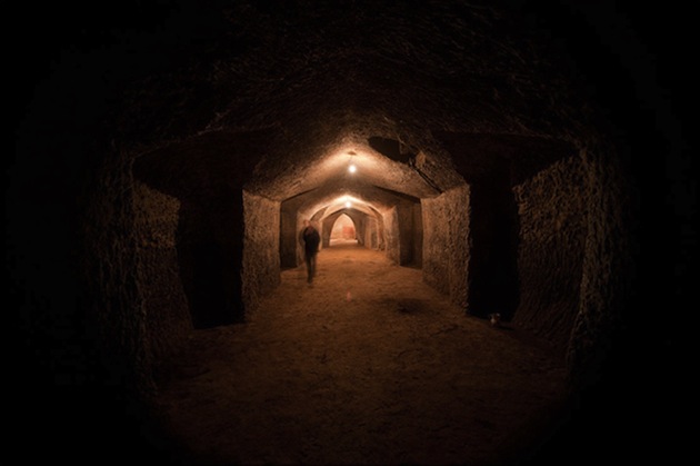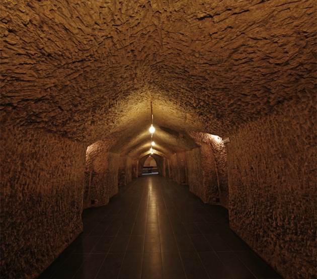 Le métro ? Une abbaye ? Non, vous êtes dans les chais souterrains de El Castillo en Espagne. Nouvellement construit, il a la forme d’une long couloir qui s’enfonce progressivement dans la terre à partir d’une entrée très graphique. Etonnant.