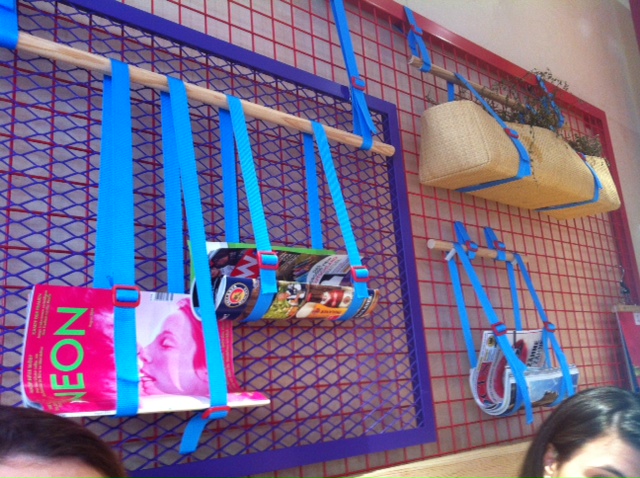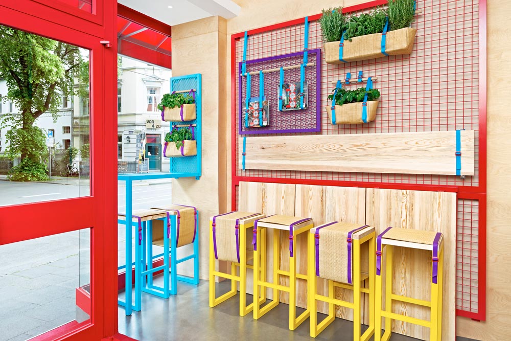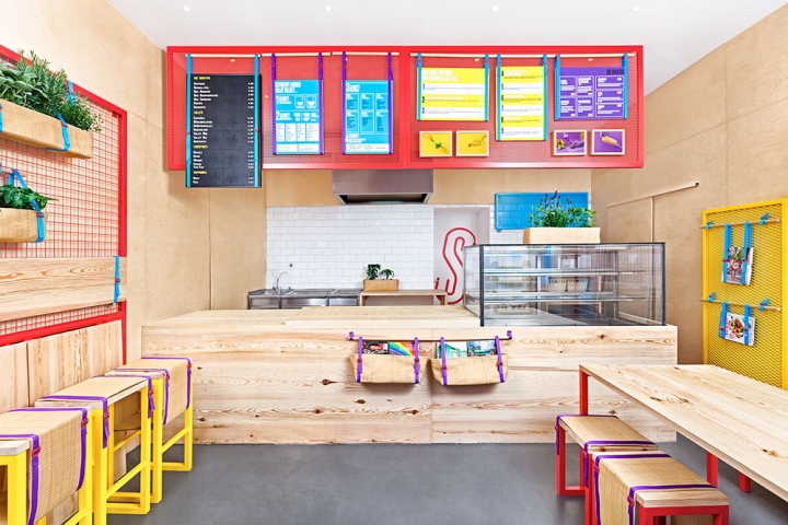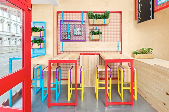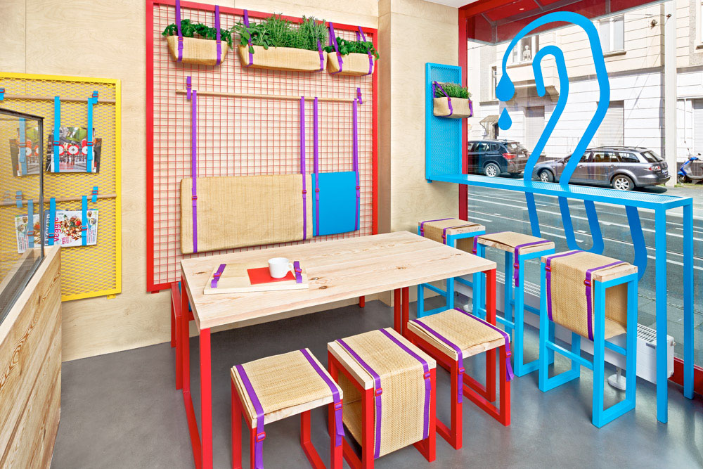This place looks deliciously fresh and tasty, thanks to this very interesting interior design. Pine wood and childish colours create a unique atmosphere and the use of the walls to accommodate services helps this tiny place to be welcoming.