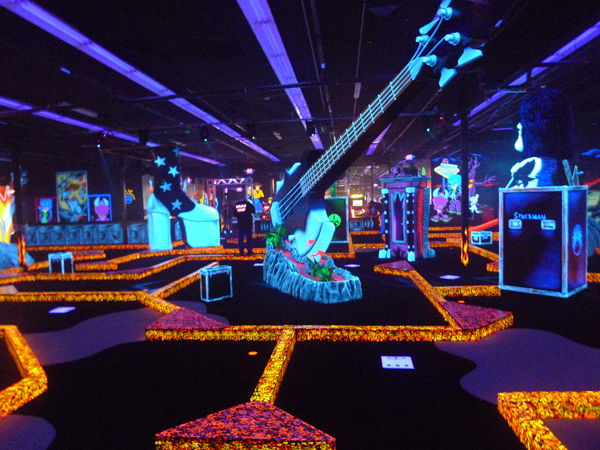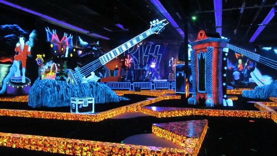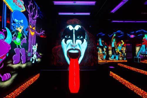 Peut-être pensiez-vous que mini-golf n’est que pour les enfants ? Et pourtant, certains (grands) enfants, fans de mini-golf ont couplé leur passion avec leur admiration pour Kiss, le célèbre groupe de hard rock. Ce mini-golf est une expérience incroyable. Vous jouez autour de célèbres icônes de Kiss, dans le noir avec balle et un club luminescents, le long de pistes fluos, tout en écoutant Kiss, bien sûr!