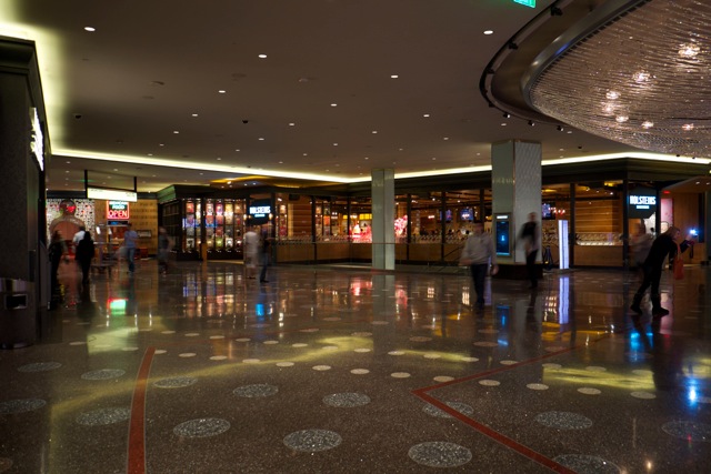 Ensuite, le lieu se transforme en un long et large couloir proposant machines à sous, jeux divers (avec une belle salle de High Limit), à la manière très classique de Las Vegas, puis des bars, dont le célèbre “bar chandelier”. Cette merveilleuse idée de bar (“flottant” sur trois étages) est merveilleusement conçu mais absolument gâté par l’emplacement car il est coincé au centre d’une rotonde ouverte, entre les escaliers mécaniques et les machines à sous.