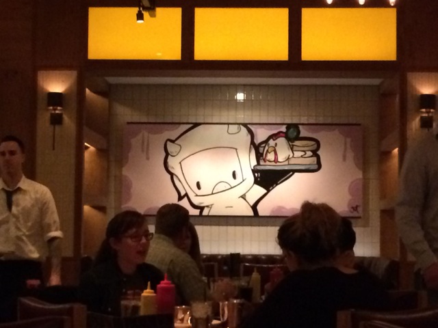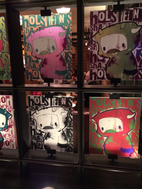 Quand il s’agit de nourriture américaine, les hamburgers et les milk-shakes sont des incontournables. Le restaurant Holsteins à l’Hôtel Cosmopolitan est entièrement dédié à ces “icônes” américaines. Grands hamburgers, beaucoup de choix de milkshakes, dans une ambiance animée. Le restaurant est organisé autour de grandes tables pour les fêtes et les familles, avec un mobilier assez simple. La décoration arty fait la différence, avec un renouvellement régulier des images autour des tables. Quand nous y étions, le porcelet astronaute très drôle était partout. Mignon, jeune et bon.