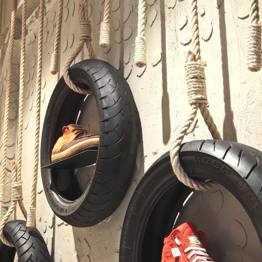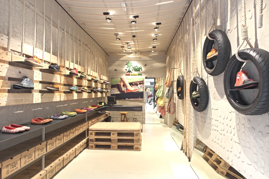 When an Ethiopian brand opens a shop in Spain, presenting great shoes produced from recycled materials, they choose to express literally what they are about: recycling raw materials and transforming them into a great experience. And this Barcelona shop clearly says that: raw walls, product presentation on recycled tires or boxes … When how you talk expresses clearly who you are ! #talkingplace