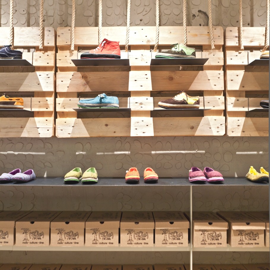 Quand une marque éthiopienne ouvre un magasin en Espagne pour présenter des chaussures fabriquées à partir de matériaux recyclés, elle choisit d’exprimer littéralement ce qu’elle fait: recycler des matières premières et les transformer en une grande expérience. Et cette boutique de Barcelone l’exprime directement: murs bruts, présentation des produits sur pneus recyclés ou boîtes en bois, palettes en guise de bancs … Quand la façon dont vous parlez exprime directement qui vous êtes! #lieuquiparle