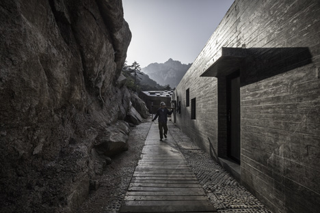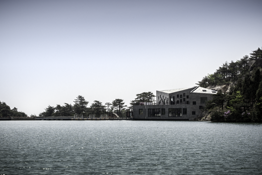 It is a contemplative place to enjoy one of the 5 sacred mountain in China; it is a house completely inserted in the mountain, its shape following the waterside in front of it and the rock walls behind it; and finally, it is also a house that hosts a restaurant, a tea house, rooms for travellers and a view-point at the exact water level. A place, part of the Sacred Mountain experience, for sure !
