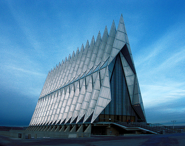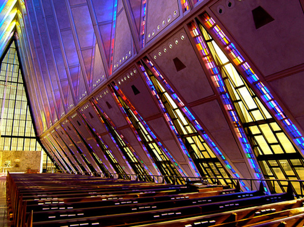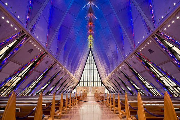 150 pieds de haut et une évocation immédiate de l’aviation, un peu démesuré pour une chapelle, non ? Pour ajouter à ses éléments distinctifs, on peut noter que la chapelle est en fait un ensemble de trois chapelles: une pour la religion protestante, une pour la religion catholique et une pour la religion juive. Crée en 1962, elle est unique en son genre et le lieu religieux le plus visité du Colorado.