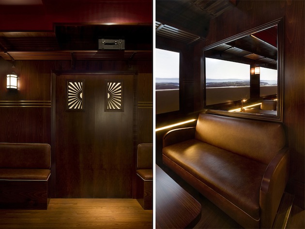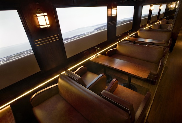 Hommage aux wagons restaurant du siècle dernier, en même temps que solution design innovante à un lieu sans ouverture sur l’extérieur: ce bar a tout bon. Assis dans les sièges en cuir, vous siroterez un cocktail en regardant les paysages du monde entier défiler sur des écrans vidéo géants. Une expérience du voyage assez inédite.
