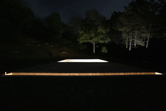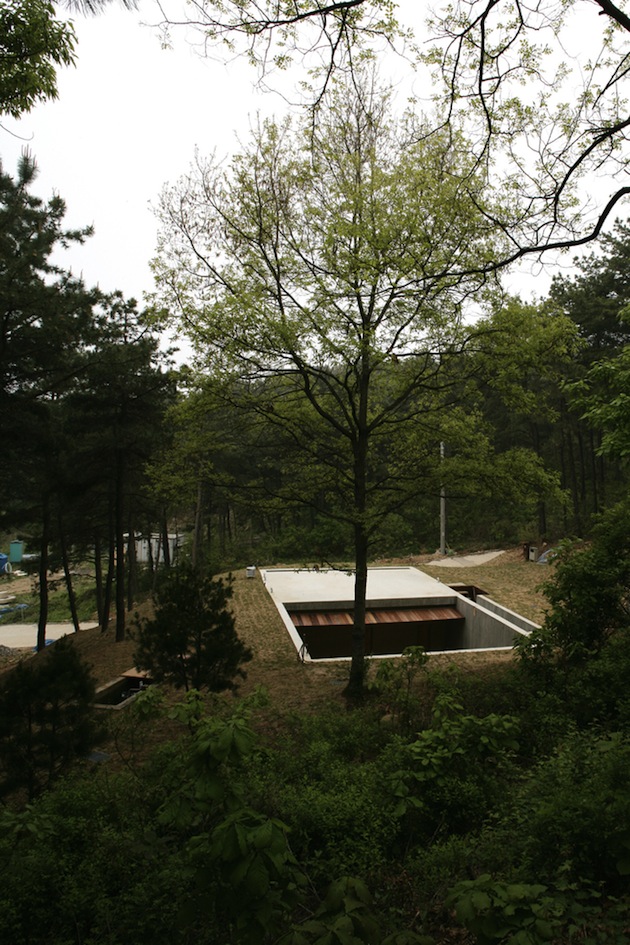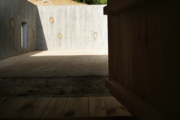 This is no enter to a parallel world. And yet … If places are born to answer needs, this kind of place is quite rare, at least in Europe. This is a meditation hut. At the right scale, it helps to isolate, sitting facing a quiet pond, to meditate. Built in a semicircle to set you out of the road noises, getting smaller at the end of the hut to push viewers to seat, its sleek design is a tempting invitation to serenity and silence.
