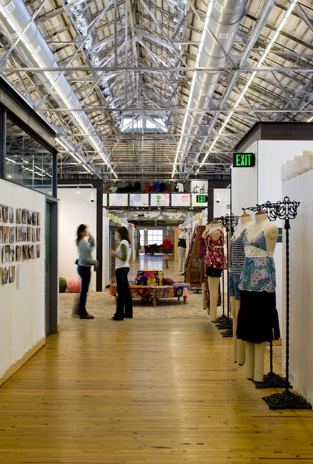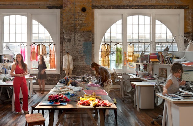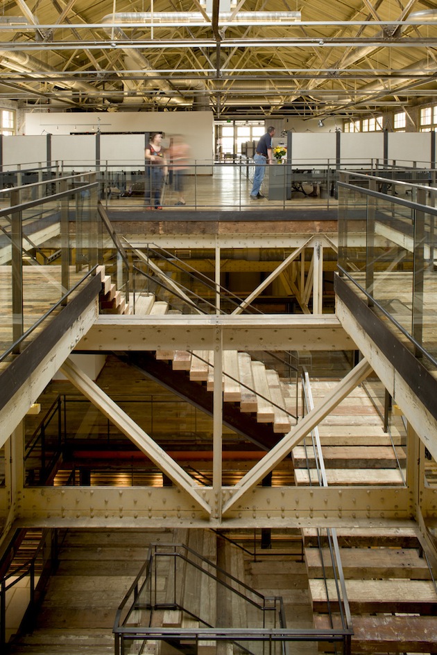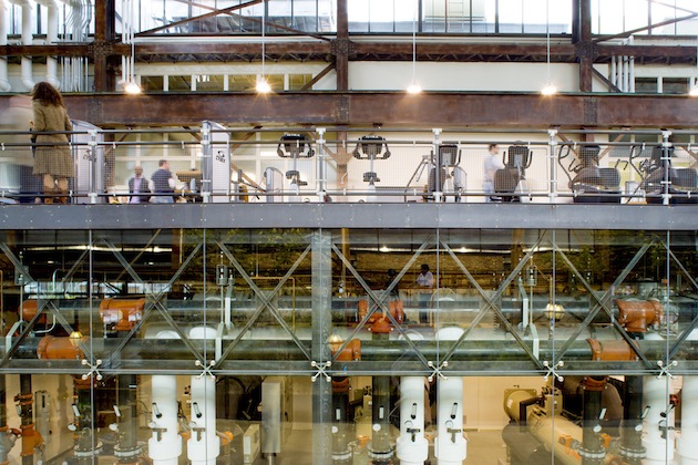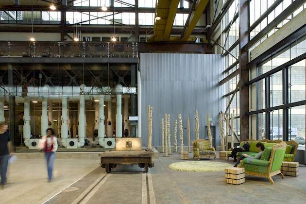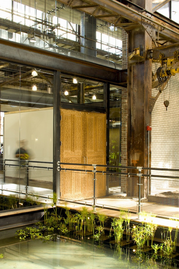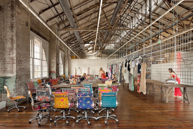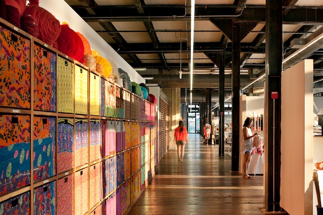 Urban Outfitters, et ses marques soeurs Anthropologie et Free People, partagent toutes une esthétique qui mêle rusticité, délicatesse et respect du vivant. Rien d’étonnant donc à ce que leur siège social soit un ancien site naval de la Navy. On y retrouve l’aspect brut des espaces industriels (briques, pierres et poutres), qui se marrient magnifiquement avec les textiles, les couleurs et les espaces verts. Un campus de marques !