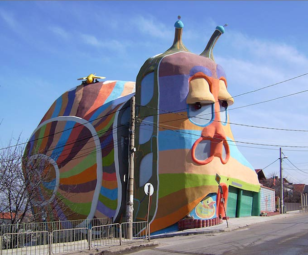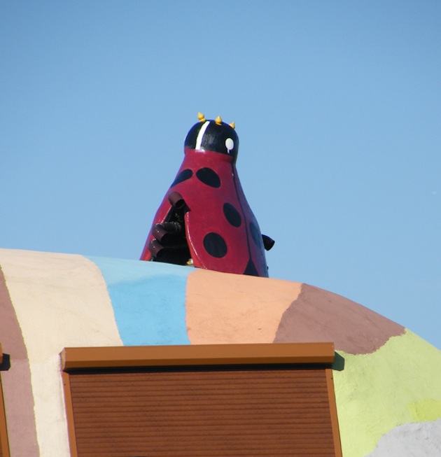 Qu’ajouter à cet ovni architectural ? Peut-être que rien n’est gratuit dans les décorations de cette maison incroyable : les antennes sont des paratonnerres, la coccinelle, une cheminée, les yeux, des relais de ventilation, … Une maison écologique pour un animal écologique !