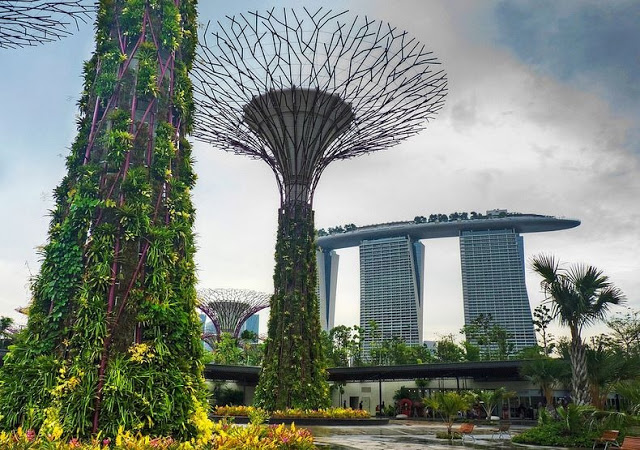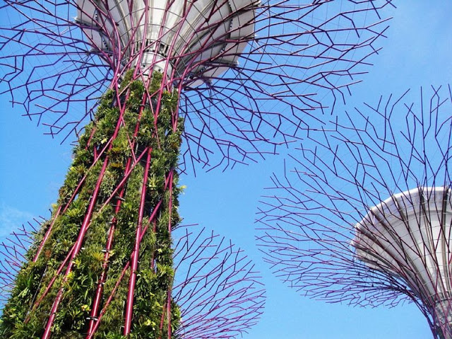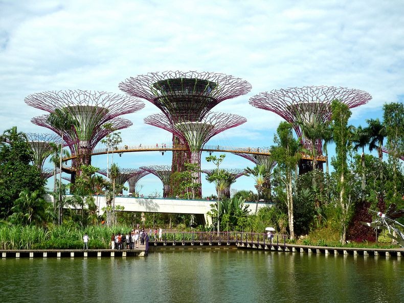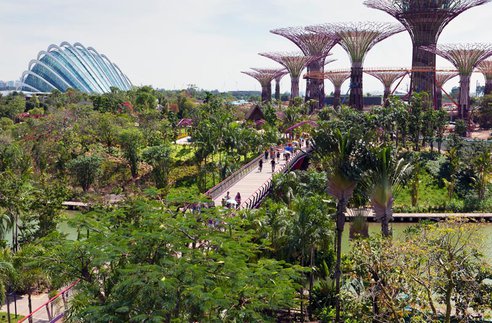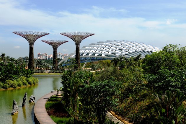 Ce projet est tellement démesuré que l’on ne sait par quel bout l’expliquer : 18 arbres géants, mesurant entre 25 et 50 mètres; conçus en jardins verticaux abritant des espèces rares et grimpantes; à la pointe de la technologie, puisqu’ils produisent leur propre énergie (avec des capteurs solaires), leur permettant de diffuser de l’énergie et de s’illuminer la nuit; ils produisent leur propre irrigation, en transformant l’humidité en eau et en la diffusant aux plantes incluses dans leur tronc; ils produisent leur propre ventilation et participent à la climatisation des serres attenantes. Des merveilles de conception, de technologie, de respect de l’environnement. Et des beautés tout court, que vous pouvez approcher de tout près grâce aux chemins suspendus. Quand Singapour décide de s’investir dans la protection de l’environnement, leurs réalisations sont à la hauteur de l’enjeu.
