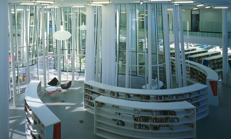 Light and transparency evoke the usage simplicity of the place, and they allow media and knowledge to be very visible. Colourful accessories attract you to the sittings and the quality of the chairs and benches make sure you stay as long as possible. Clarity in media presentation ensure that finding and choosing is easy and enjoyable. A perfect place to learn in.