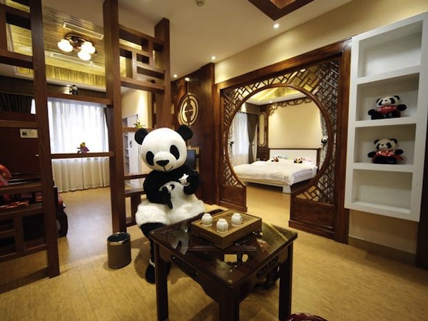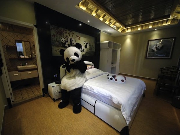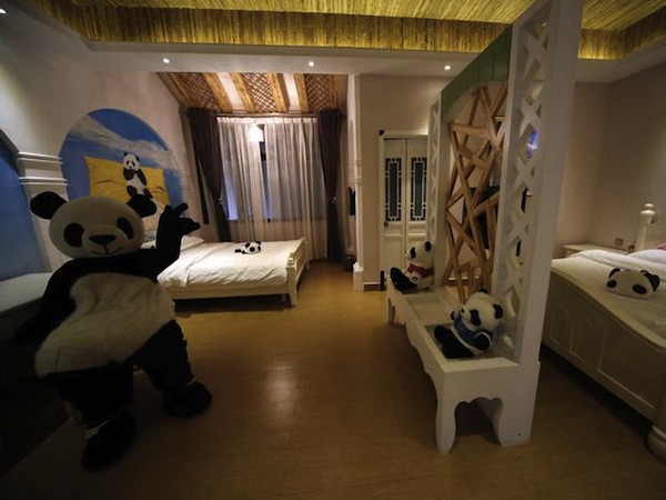 Incroyable que personne n’y ait pensé avant ! Voici le premier hôtel thématisé Panda. Il est situé en Chine au pied de la montagne où les touristes viennent voir les pandas. Une décoration très chinoise, agrémentée de pandas en peluche, de dessins de pandas, et surtout d’un personnage panda qui vous accueille, vous oriente et vous distrait également au piano!