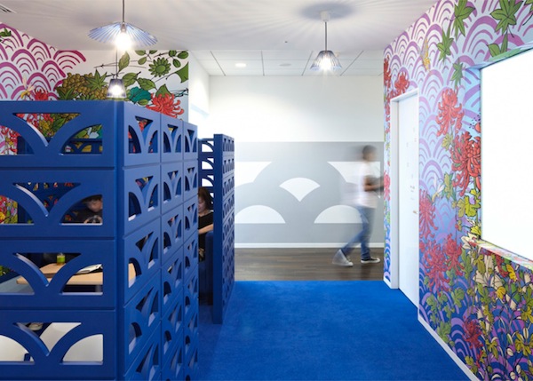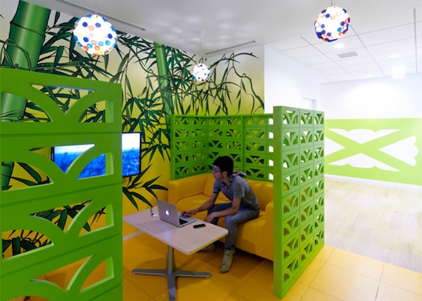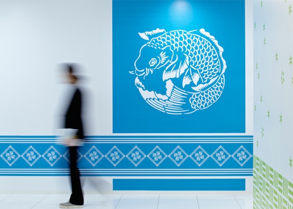 Vous êtes dans les bureaux de Google au Japon. Toujours un esprit coloré, toujours une stimulation créative, mais ici un ton très japonais au travers d’un choix de tissus, de dessins, d’objets typiquement nippon.