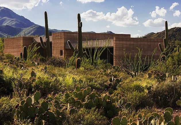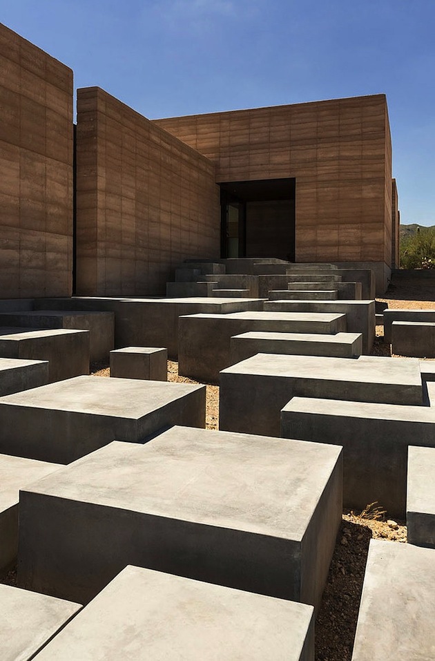 Poser une maison dans un désert pose toujours la question de l’insertion car un milieu hostile est peu adaptable. Cette maison a décidé de poser des formes cubiques dans ce désert d’Arizona et le résultat est superbe. Mais je ne suis pas sûre que les cubes de l’entrée soient vraiment accueillant …