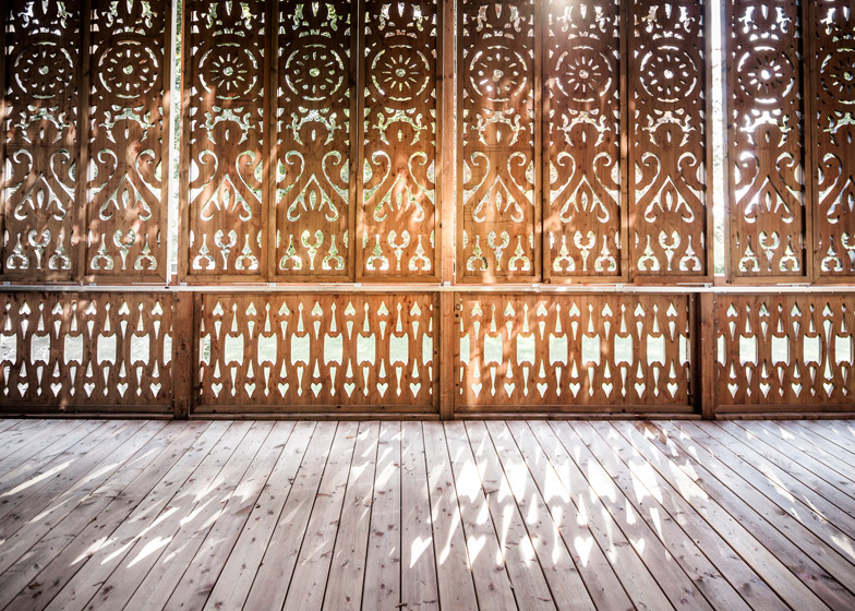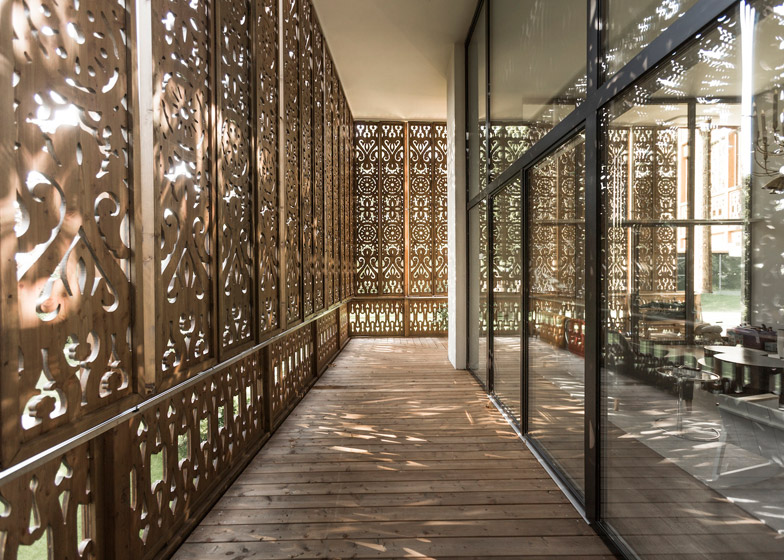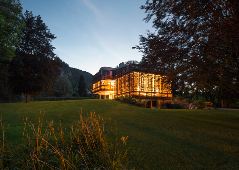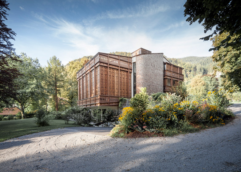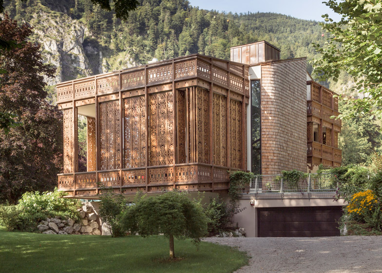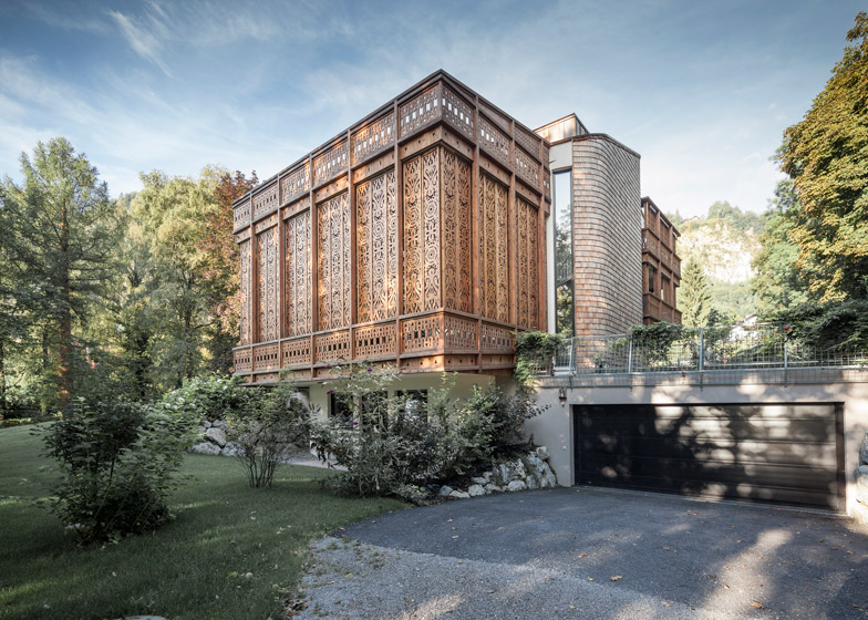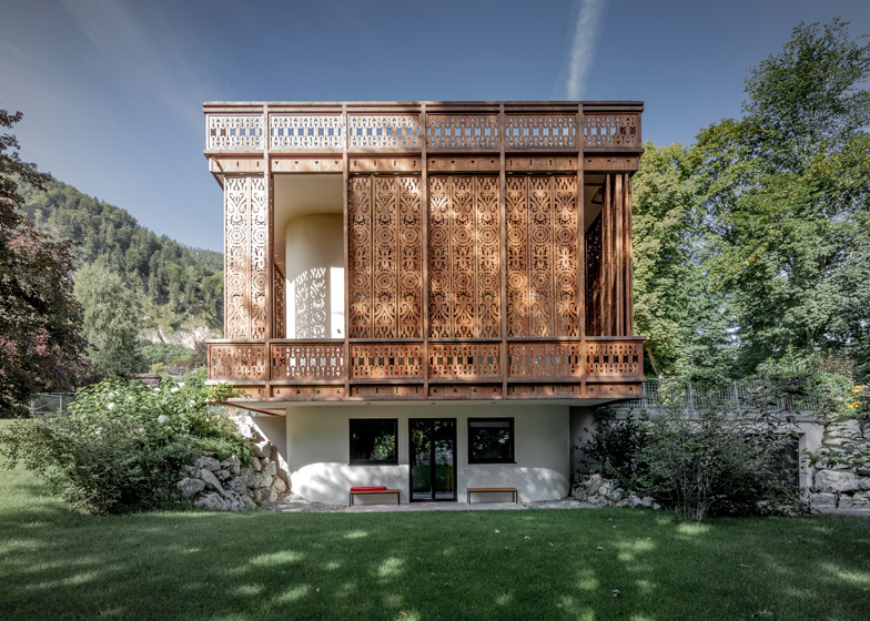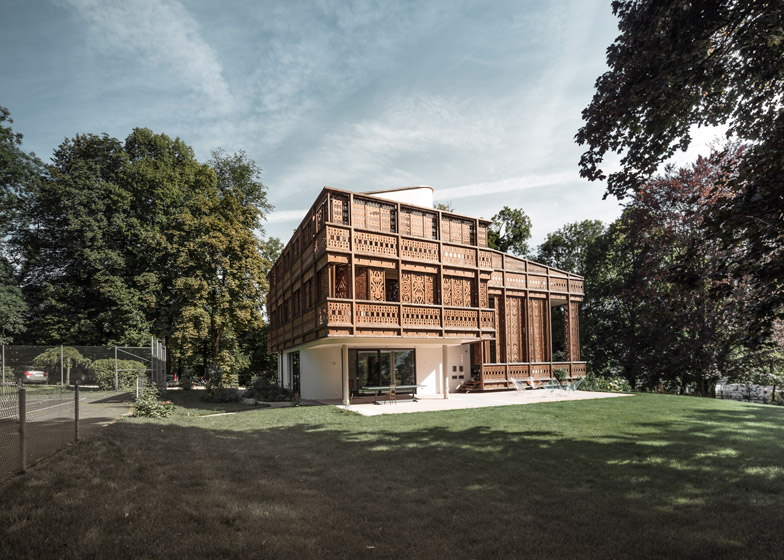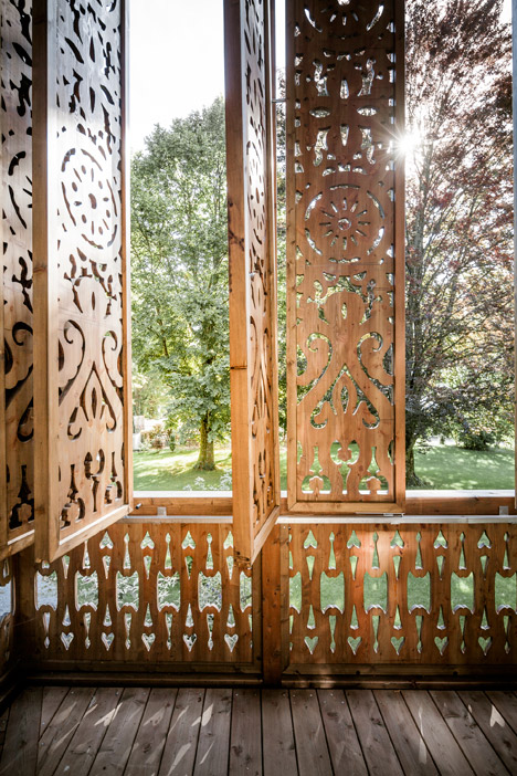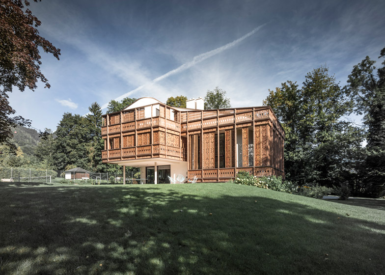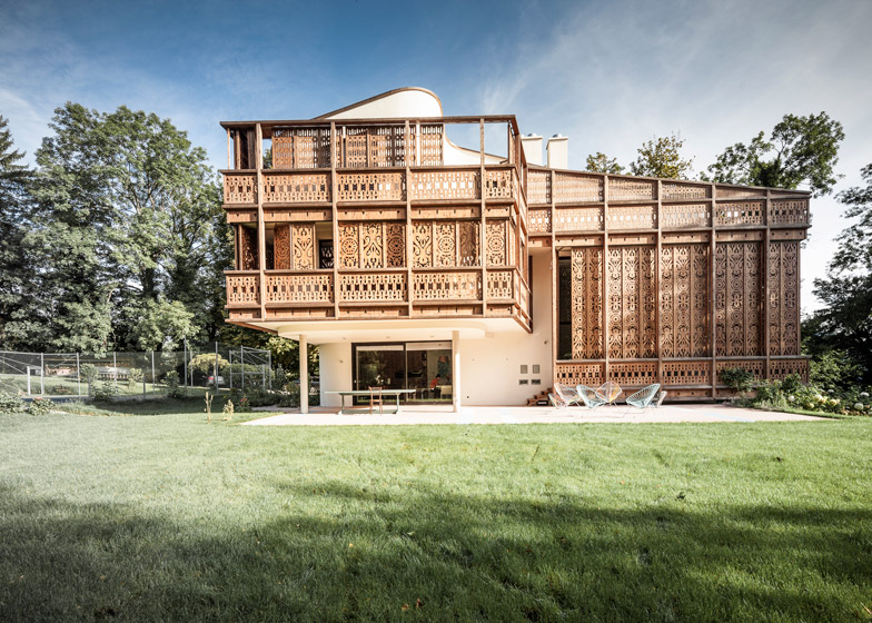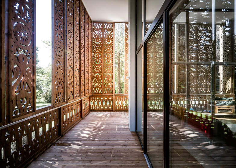 To ensure privacy to a family in their house, the old tradition of inside wooden panels has been totally reinvented in this villa by the lake. Surrounding the house, with different heights and decoration, they bring a unique atmosphere to the inside of the house, and protects from outside viewing without becoming a bunker (see the Polish version of private home). Beautiful and tasteful.