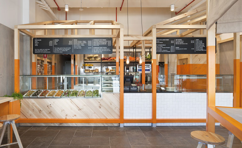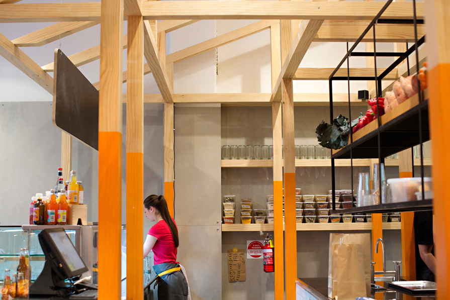 Du orange vif. Des tabourets et des tables basiques à la Ikea. Des murs de ciment brut. Aucune suspension pour les lampes, juste les ampoules. Un décor et un confort réduit au minimum. Et une chaîne de Salad Bar en pleine expansion.