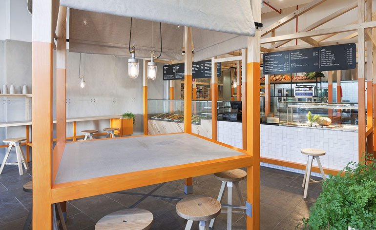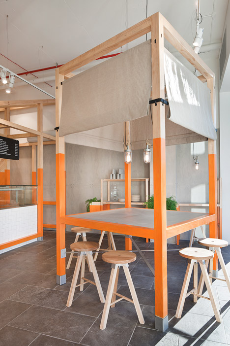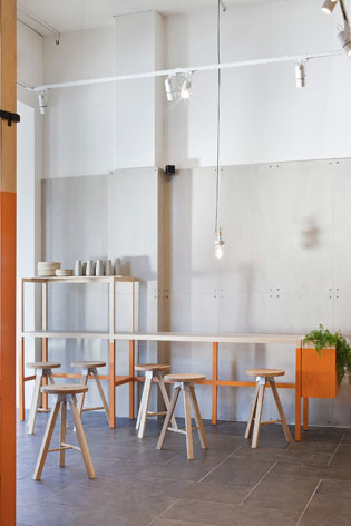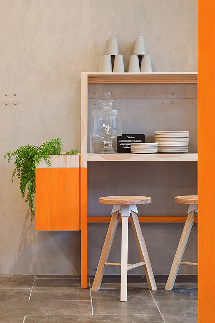 Bright orange color. Basic Ikea-style stools and tables. Cement walls. No light suspension, just bulbs. A minimalist decor and comfort. A rising salad bar chain.