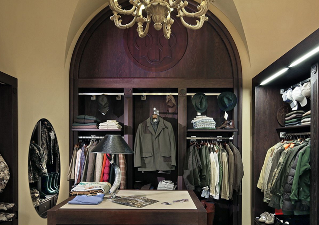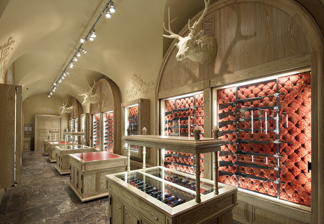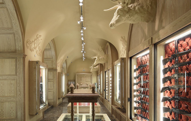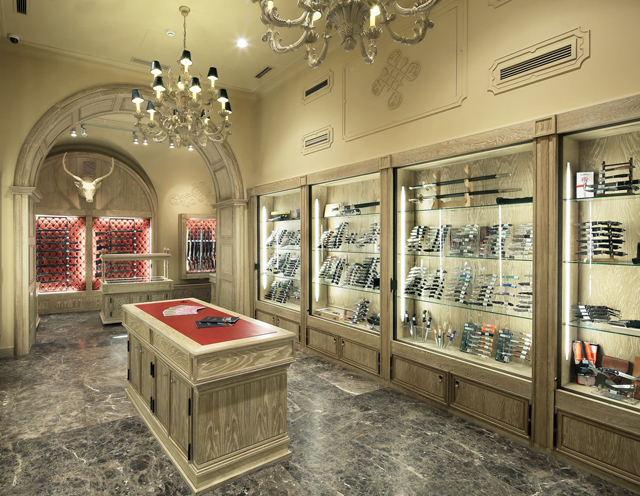 Here is another, quite bold, because this time jewelry shop codes are used to sell weapons: brocades, marble, sophisticated lights, displays … each jewelry codes work wonders to magnify the weapons and the shop. This design code translation feels quite relevant and well done.