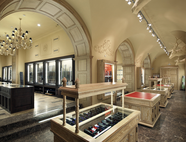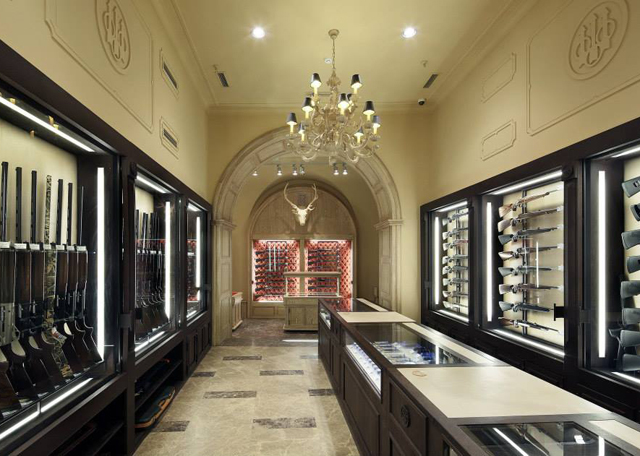 En voici un autre, assez original car cette fois-ci, c’est pour vendre des armes que les codes de la joaillerie sont choisis: brocards, marbres, lumières sophistiquées, présentoirs… tous les codes des bijoux fonctionnent à merveille pour magnifier ces armes. Une translation d’univers de lieu assez pertinente et bien réalisée.