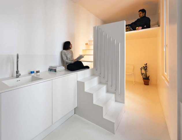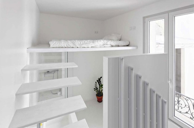 Paris is known for its tiny apartments. In this one, thanks to the use of color, the space becomes homey and structured. All painted white and open to the outside thanks to large windows, it is the actionable yellow light at the end of the room defining the bathroom area, that makes the difference. Turn it on and it changes everything in the perception of micro-loft.