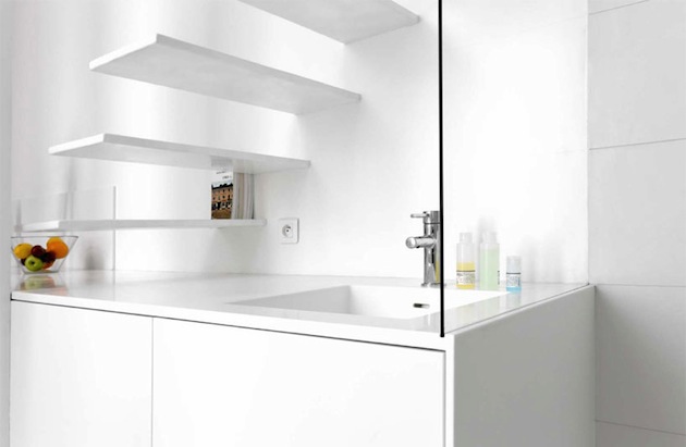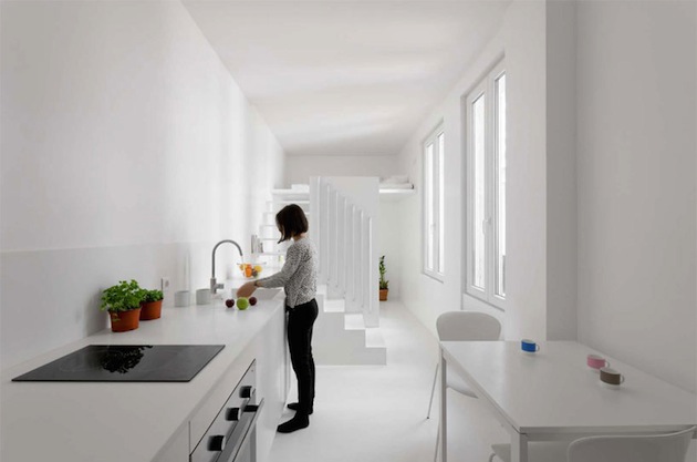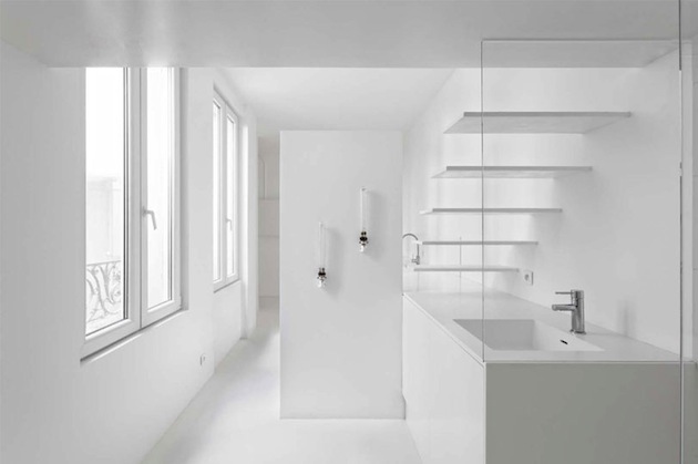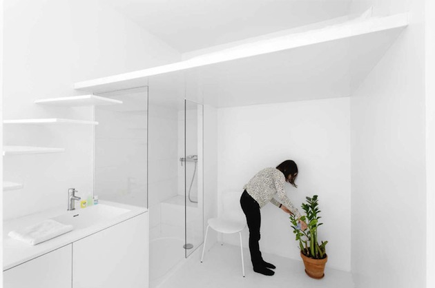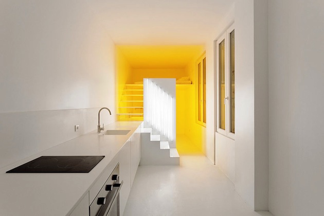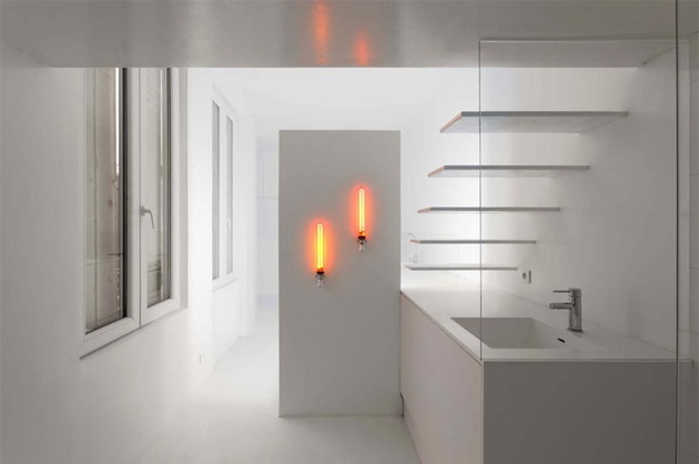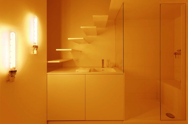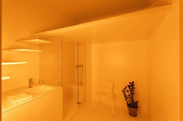 Paris est connu pour la petite taille de ses appartements. Dans celui-ci, c’est grâce à l’emploi de la couleur que la surface minuscule devient habitable et structuré. Entièrement blanc, ouvert sur l’extérieur, c’est une lumière jaune qui délimité, à la demande, la partie salle de bains. Et cela change tout dans la perception de ce micro-loft.