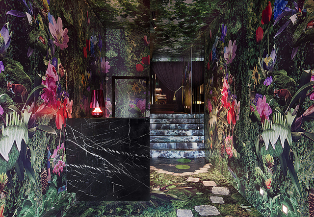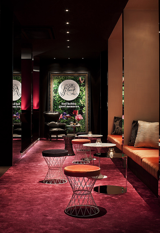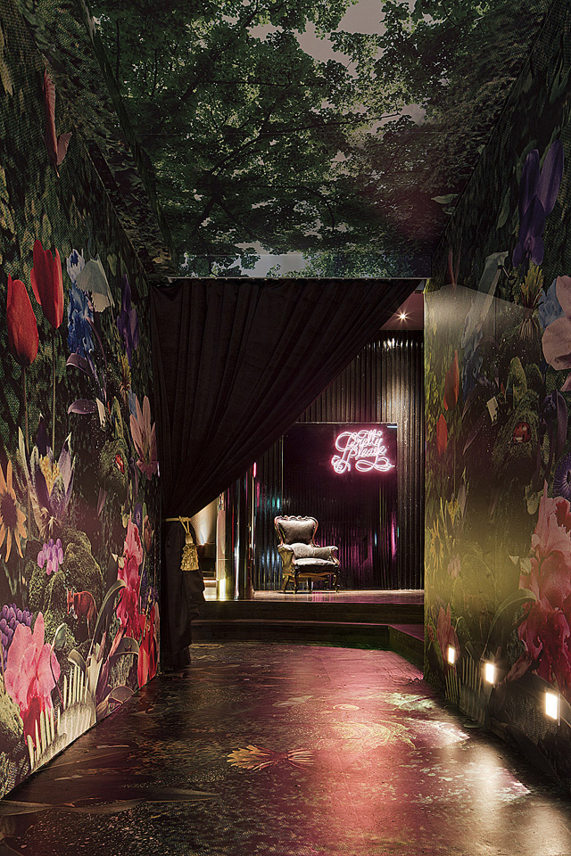 The entrance of a bar-club must radically immerse you in another atmosphere, and make it clear that you are in a place where you can treat yourself. The entrance to this club is a success in that purpose. Through a jungle corridor, you instantly change universe. Lush, immersive and impactful, the decor plays here a strong role. You have only one desire after the corridor: sit and feel the atmosphere . Then, the club motto “Bad habits, Good manners,” invites you to sip slowly and enjoy yourself. Beautiful staging.