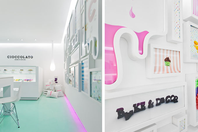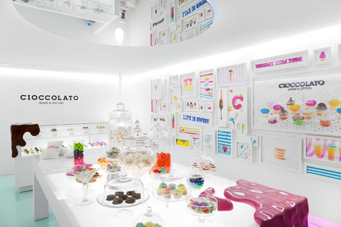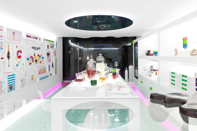 Le chocolat fondu a une texture particulière. Cette boutique de chocolat a choisi de s’inspirer de cette onctuosité, plutôt que de la couleur sombre que le chocolat évoque d’ordinaire. Et ce choix donne une belle personnalité à son design intérieur.