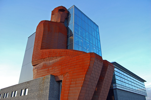 Goldfinger serait-il passé par Guimaraes au Portugal ? Toujours est-il que le nouveau musée des Arts est entièrement doré. Le bâtiment, fait de plusieurs structures carrées, à différents niveaux, entièrement recouvert de tubes de cuivre doré, est imposant sans être lourd. Il invite à l’approche et au toucher. En contraste, l’intérieur est d’une épure parfaite, blanc pour les espaces d’exposition et noir pour les espaces interactifs (salles de projection par exemple). Une réussite.