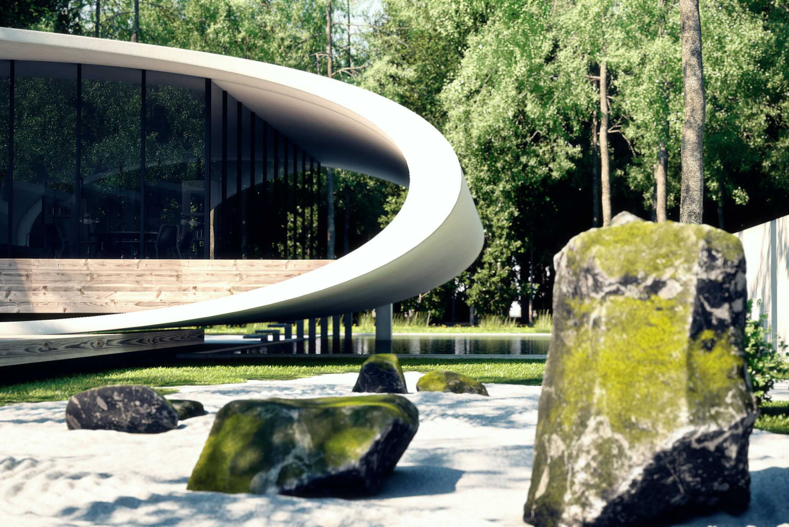 Cette maison, construite au milieu d’une forêt, a choisi de coexister de façon pacifique avec elle. En l’enveloppant, en se lovant autour de ses arbres et de ses petites collines, elle fait corps avec la forêt tout en la respectant. Et cela crée une maison magnifique, aux volumes arrondis très agréables et à l’ouverture constante vers l’extérieur.