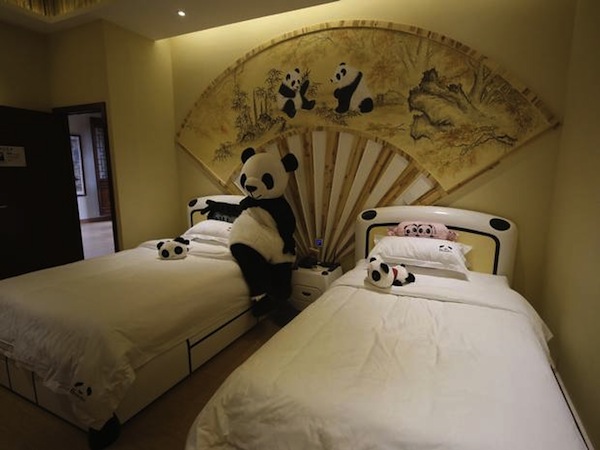 Incroyable que personne n’y ait pensé avant ! Voici le premier hôtel thématisé Panda. Il est situé en Chine au pied de la montagne où les touristes viennent voir les pandas. Une décoration très chinoise, agrémentée de pandas en peluche, de dessins de pandas, et surtout d’un personnage panda qui vous accueille, vous oriente et vous distrait également au piano!