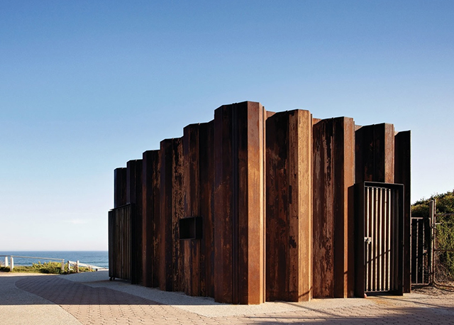 The steel plates chosen to build the kiosk were previously used to protect buildings during the recent Victoria floods and their gross appearance, slightly rusty, was kept unchanged for the creation of the walls of the booth. This place provided bathers and surfers, high quality coffee, changing rooms and toilets. A very successful recycling.