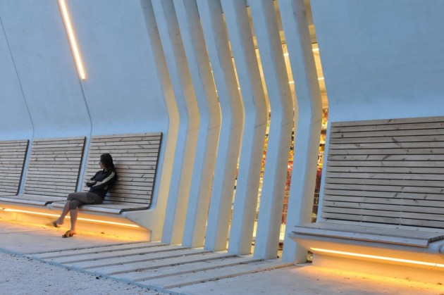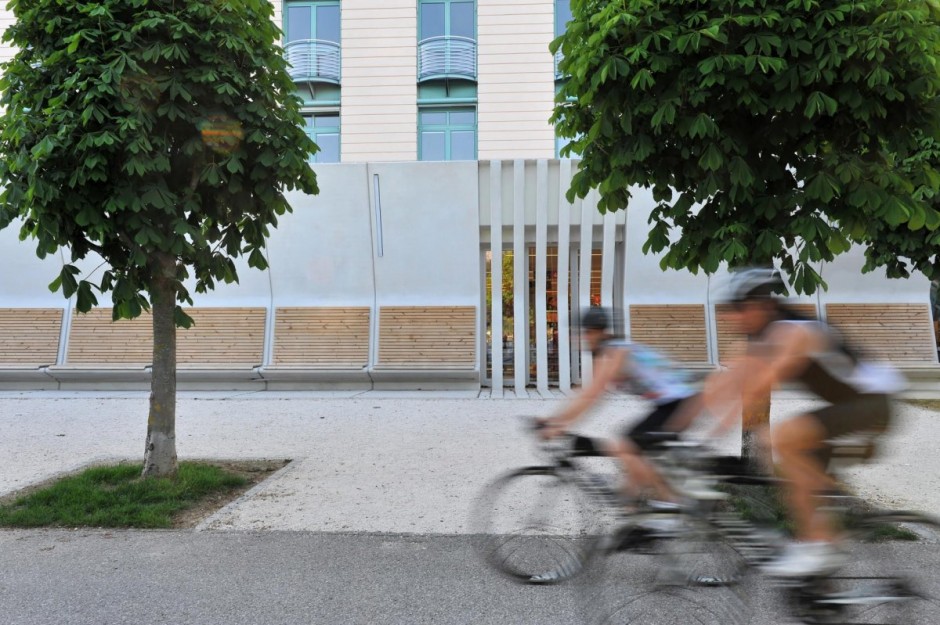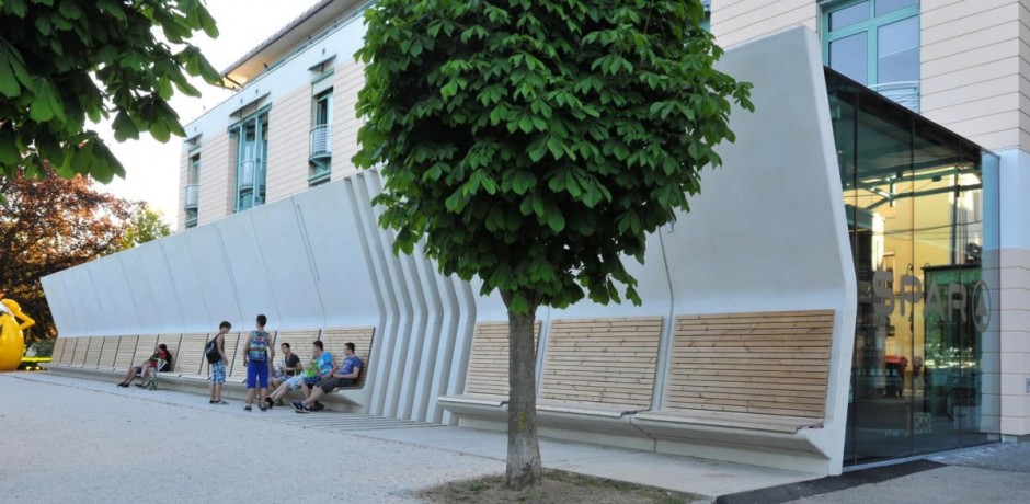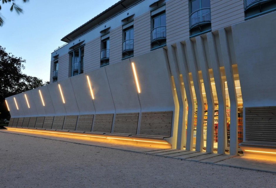 Supermarkets and large distribution outlets are often attacked for not doing enough efforts to nicely integrate themselves in the public space. Studies have proven that money spent in those stores directly depends on the time spent there. Then, why not create nice places in which you would like to spend time, sit and relax ? Like this great SPAR supermarket surroundings …