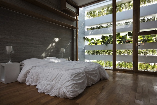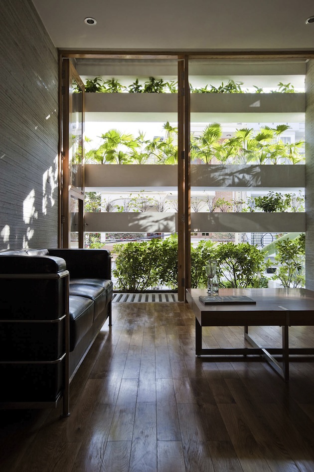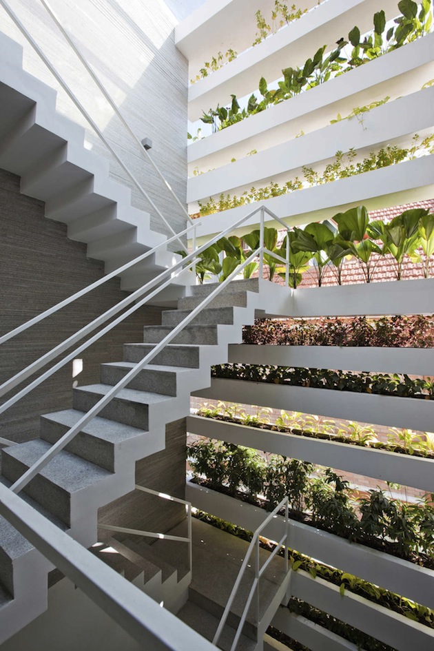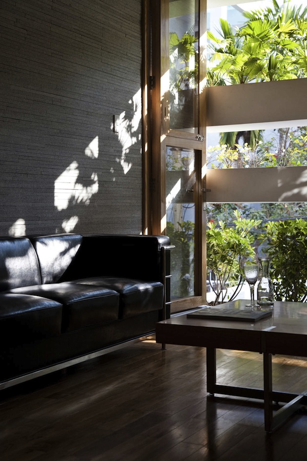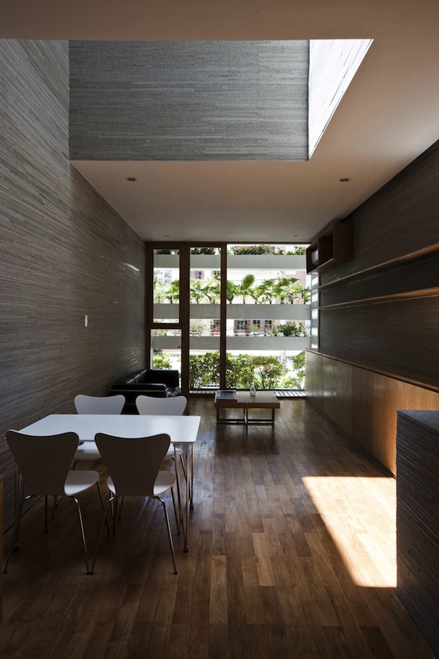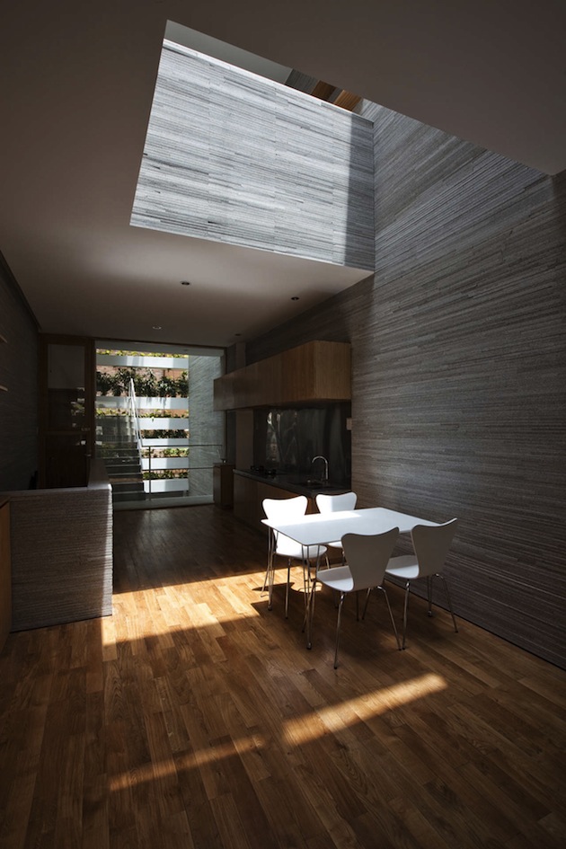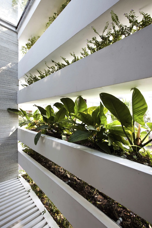 When planters become a wall, you understand differently the words “green house”. It is the combination of the green wall, the skylight throughout the house and the concrete walls that retain the freshness, that make this house a great ecological achievement.