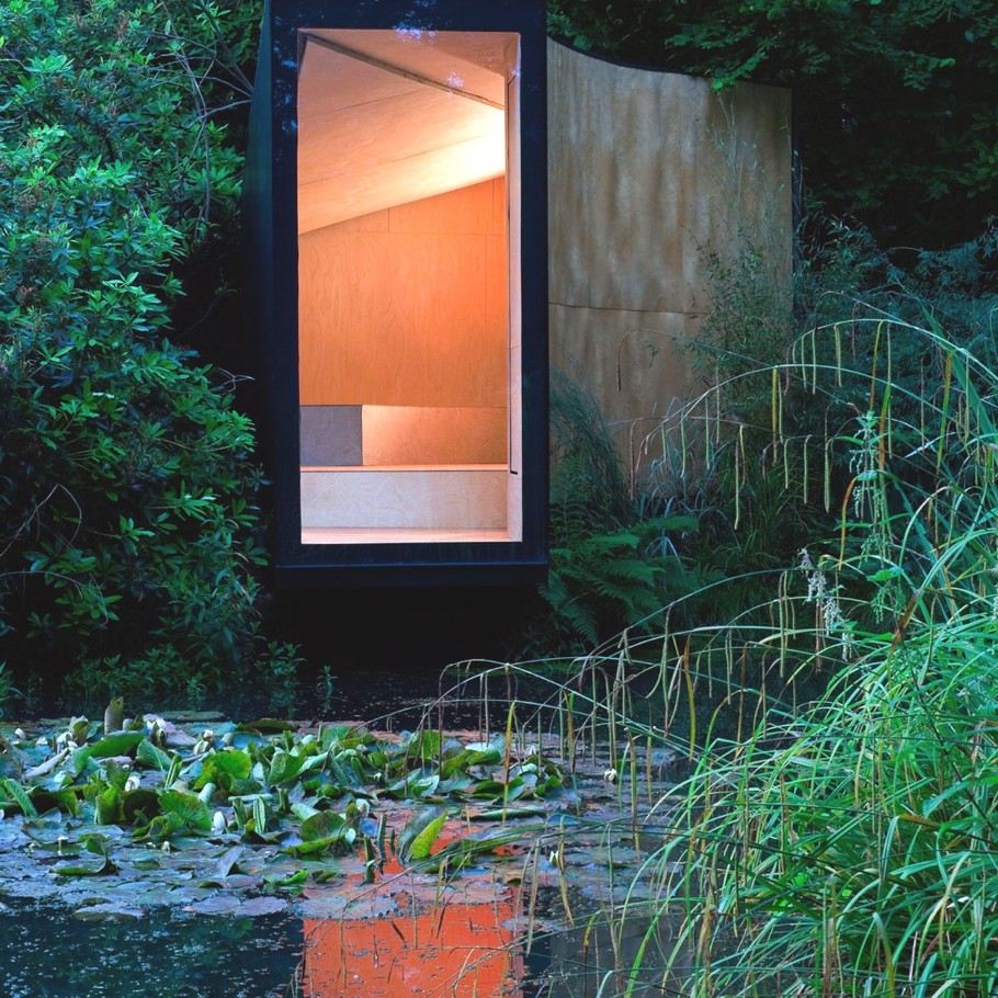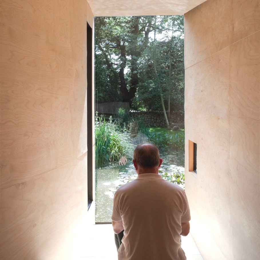This is no enter to a parallel world. And yet … If places are born to answer needs, this kind of place is quite rare, at least in Europe. This is a meditation hut. At the right scale, it helps to isolate, sitting facing a quiet pond, to meditate. Built in a semicircle to set you out of the road noises, getting smaller at the end of the hut to push viewers to seat, its sleek design is a tempting invitation to serenity and silence.