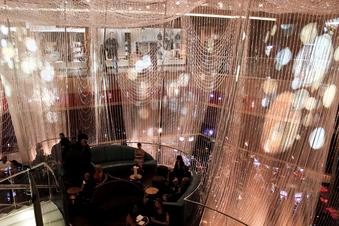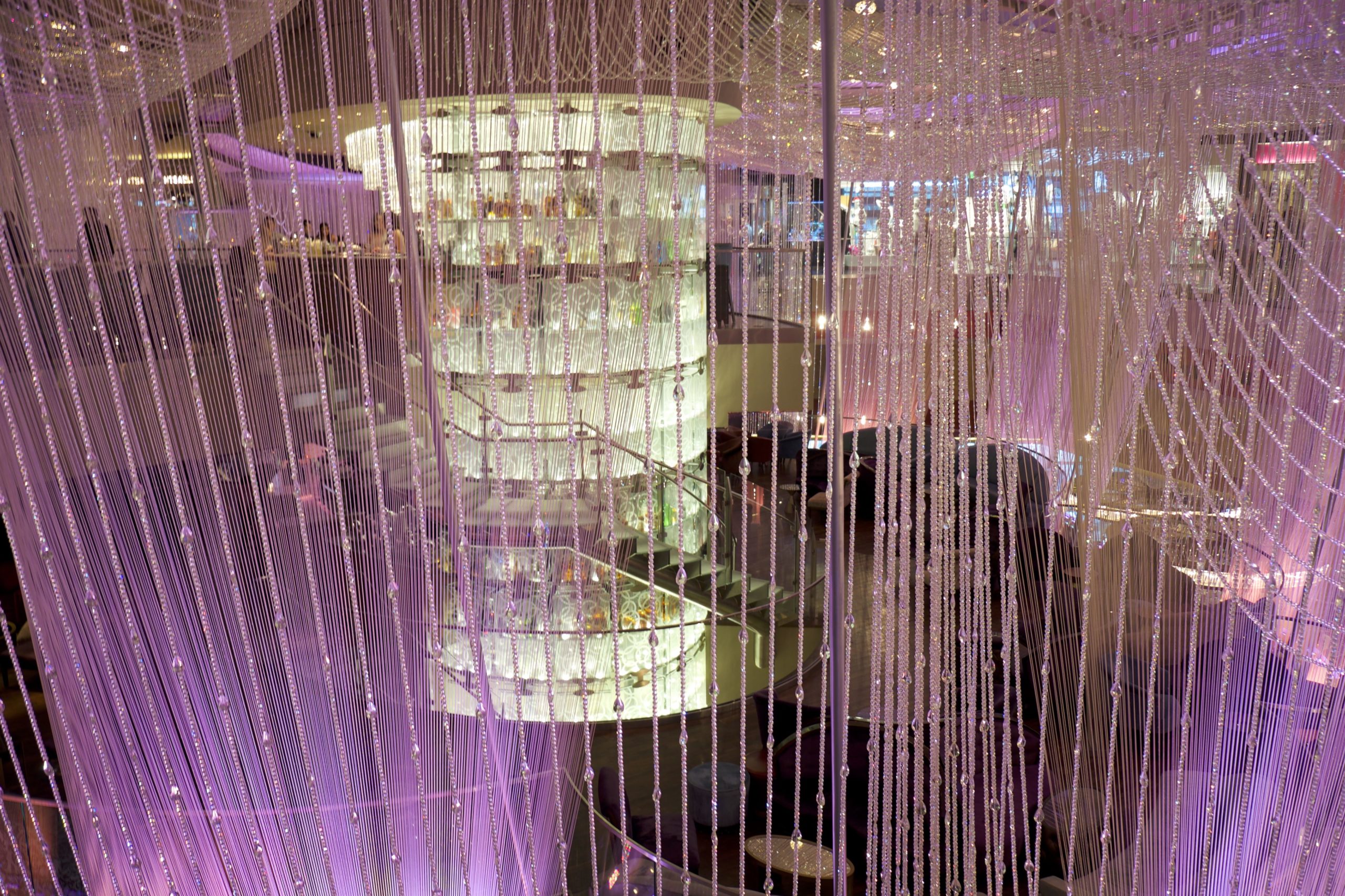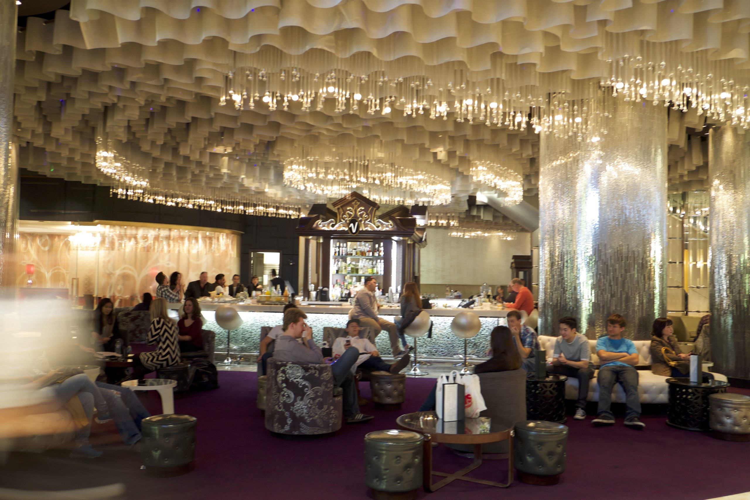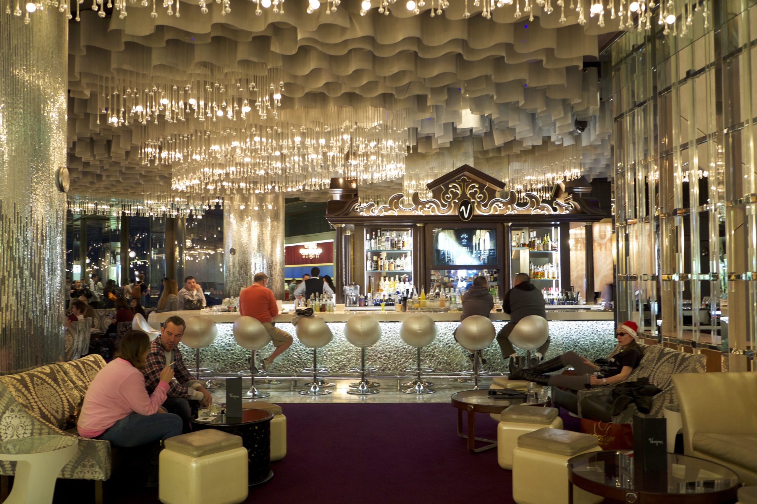 Ensuite, le lieu se transforme en un long et large couloir proposant machines à sous, jeux divers (avec une belle salle de High Limit), à la manière très classique de Las Vegas, puis des bars, dont le célèbre “bar chandelier”. Cette merveilleuse idée de bar (“flottant” sur trois étages) est merveilleusement conçu mais absolument gâté par l’emplacement car il est coincé au centre d’une rotonde ouverte, entre les escaliers mécaniques et les machines à sous.