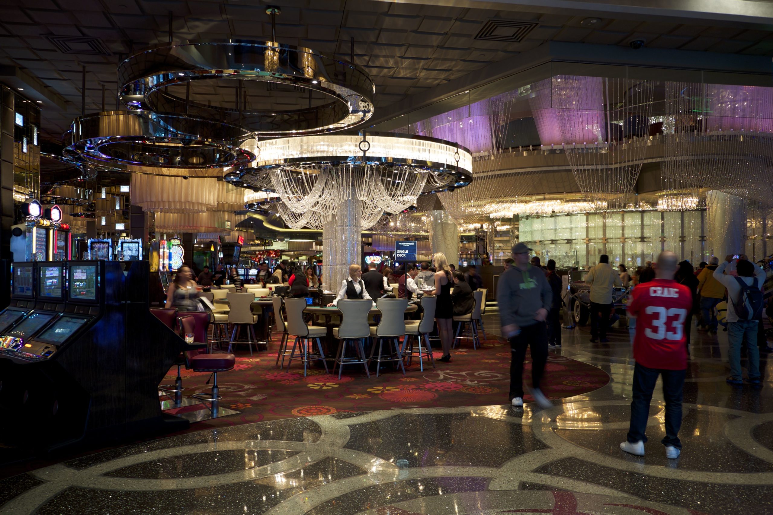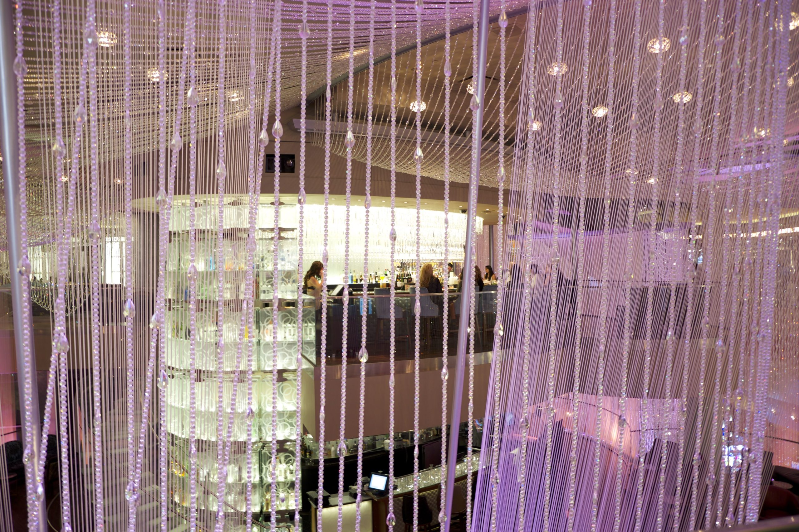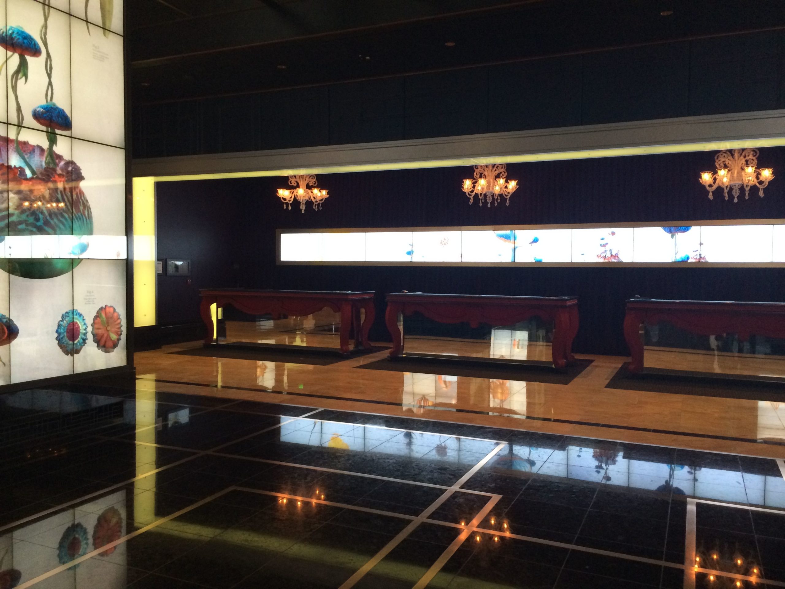 Ensuite, le lieu se transforme en un long et large couloir proposant machines à sous, jeux divers (avec une belle salle de High Limit), à la manière très classique de Las Vegas, puis des bars, dont le célèbre “bar chandelier”. Cette merveilleuse idée de bar (“flottant” sur trois étages) est merveilleusement conçu mais absolument gâté par l’emplacement car il est coincé au centre d’une rotonde ouverte, entre les escaliers mécaniques et les machines à sous.