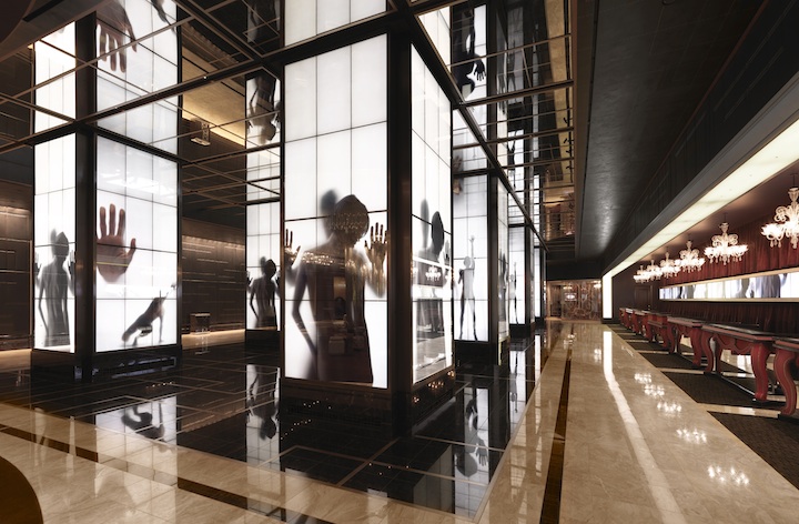 L’entrée de l’hôtel est tout à fait étonnante avec les colonnes transformés en écrans géants, projetant des visuels intriguants. Ils servent bien l’idée d’un lieu expérientiel. La réception poursuit la bonne impression avec un effet table très réussi.