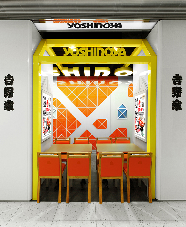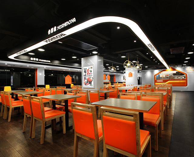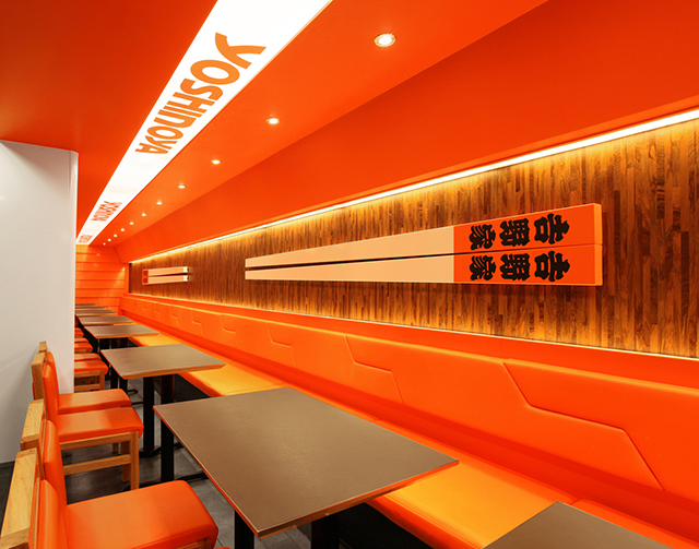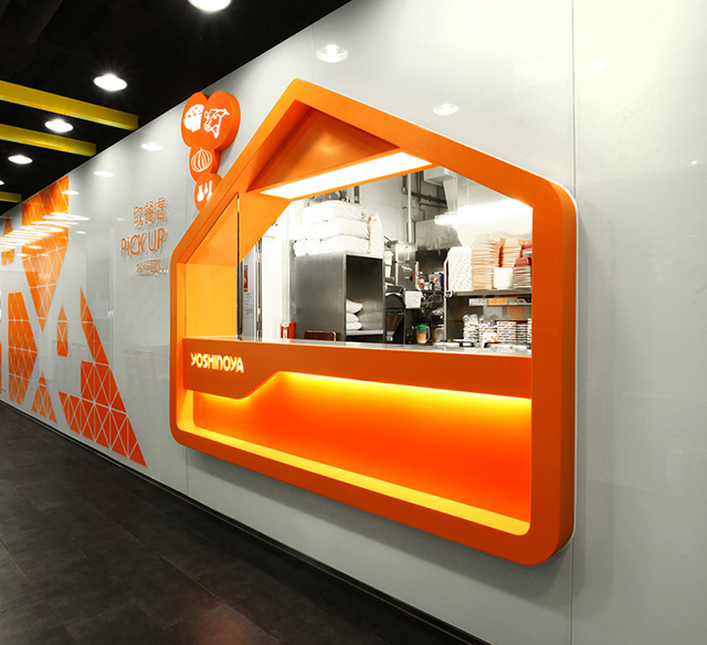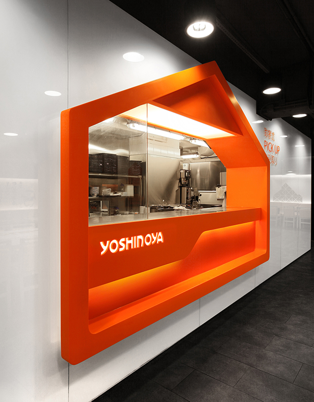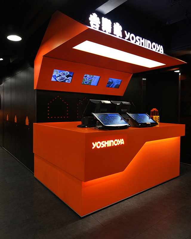 Alors que les marques mondiales de fast-food redesignent leurs restaurants pour éviter la perception de la standardisation et améliorer l’expérience de leur clients (cliquez ici pour découvrir le dernier restaurant de McDonald’s), en Asie l’approche radicalement opposée existe également. Yoshinoya est un parfait exemple de cette tendance d’utilisation systématique des codes de la marque: les dernières ouvertures de Hong Kong utilisent autant que possible le nom, le logo et les couleurs de la marque dans l’ensemble du restaurant. Et c’est finalement cette déclinaison obsessionnelle de la marque qui devient une expérience en soi, finalement agréable pour ses clients.